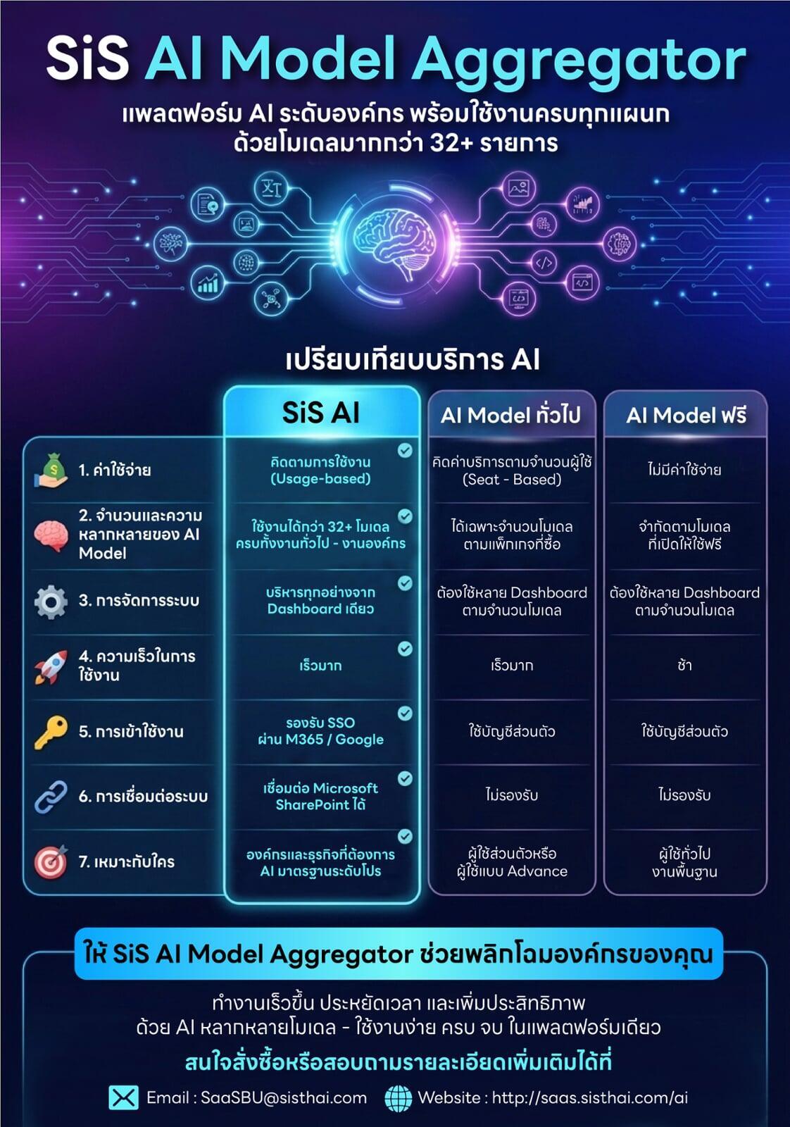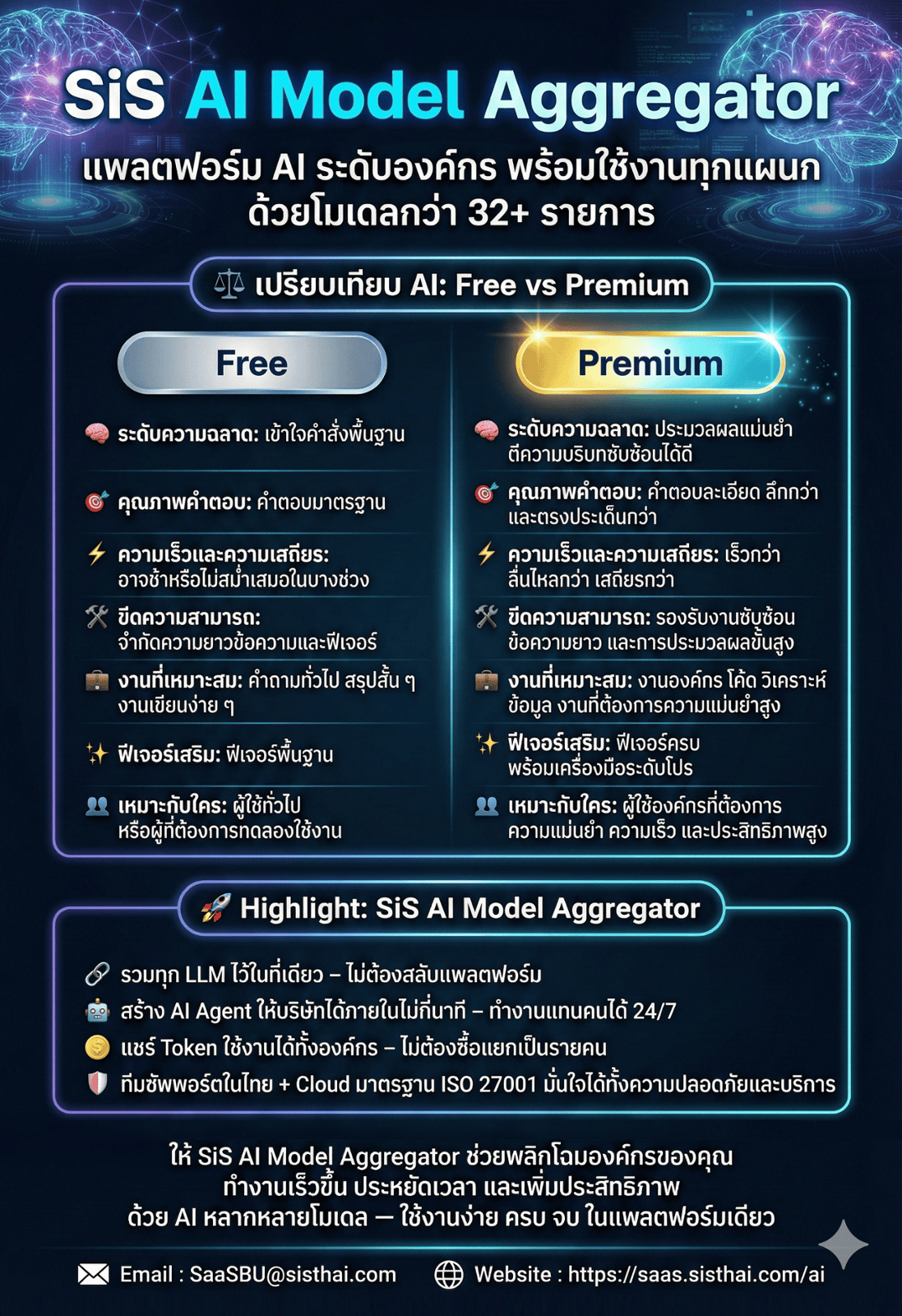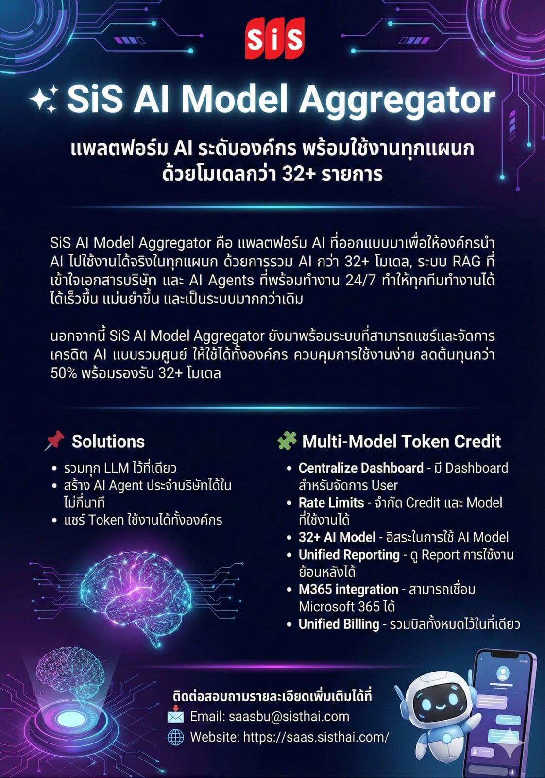 ให้ SIS AI Aggregator ช่วยองค์กรของคุณพลิกโฉมการทำงาน ประหยัดเวลา เพิ่มประสิทธิภาพด้วย AI หลากหลายโมเดล ใช้งานง่าย ครบ จบ ในฟอร์มเดียว